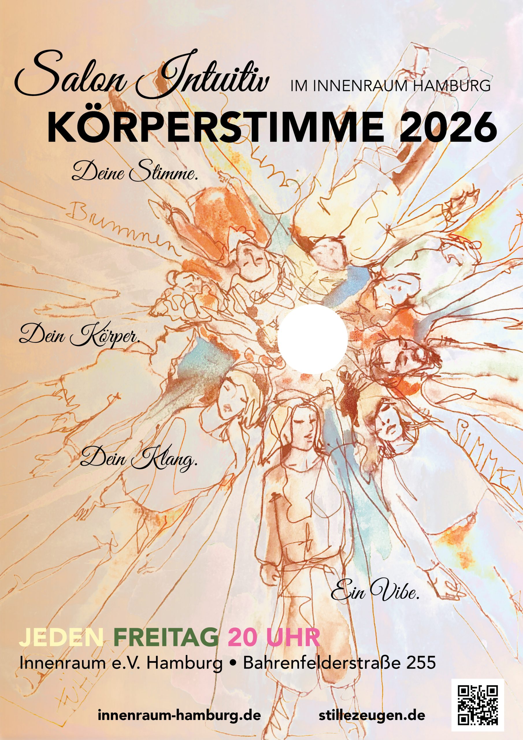 Wir verorten die eigene Stimme im Körper und lassen die direkte Umgebung von der Zelle bis zur Haut, vom Zimmer bis zum Dach, von der Erde bis zum Himmel vibrieren. STILLE°ZEUGEN vom Salon Intutitiv leiten minimalistisch an und laden zur wöchentlichen Selbsterfahrung ein.